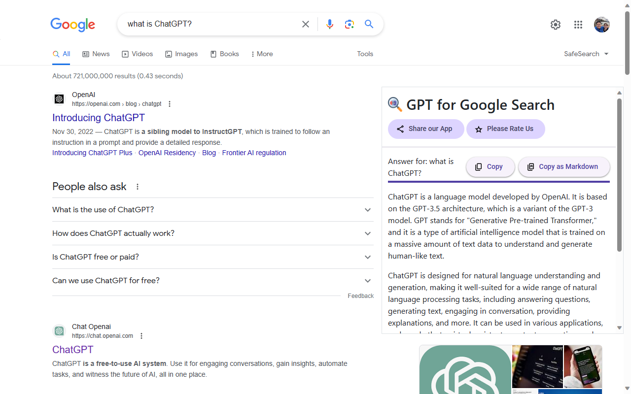 This extension allows you to use ChatGPT, a powerful natural language generation model, when you use Google Search. You can simply type your query in the search box and get a prompt from ChatGPT that will inspire you to explore more topics or generate your own content. You can also use ChatGPT to write poems, stories, code, essays, songs, celebrity parodies, and images.